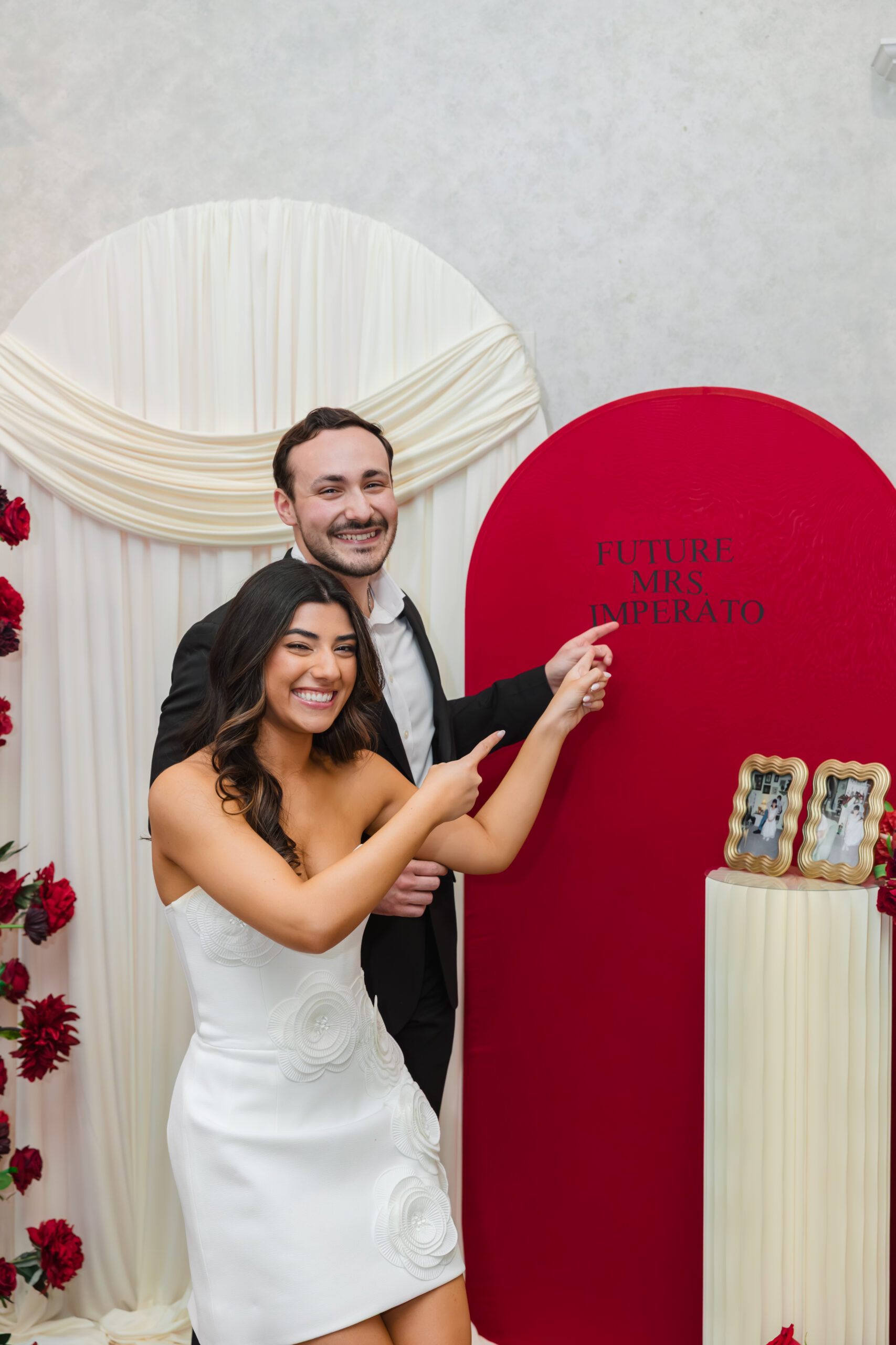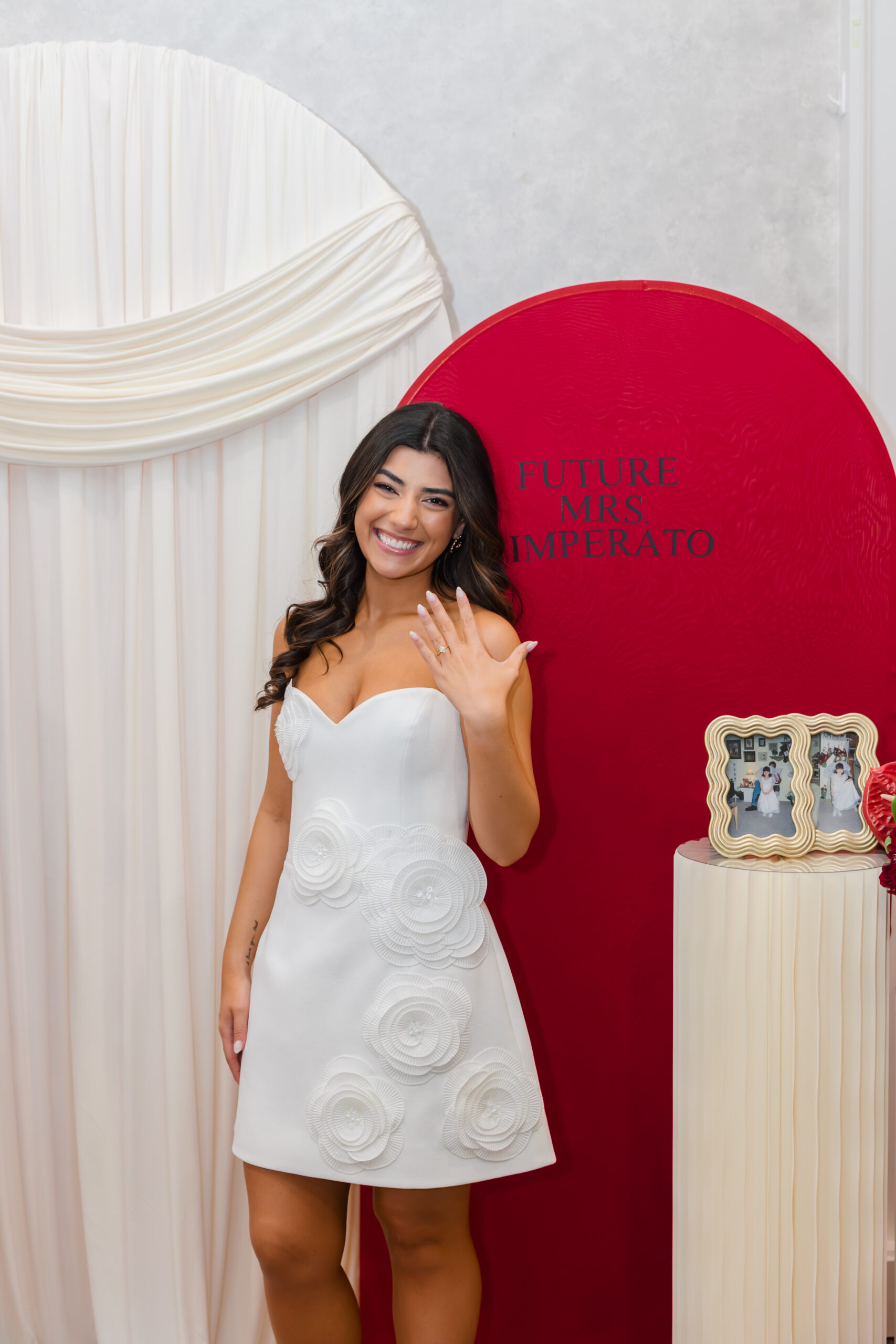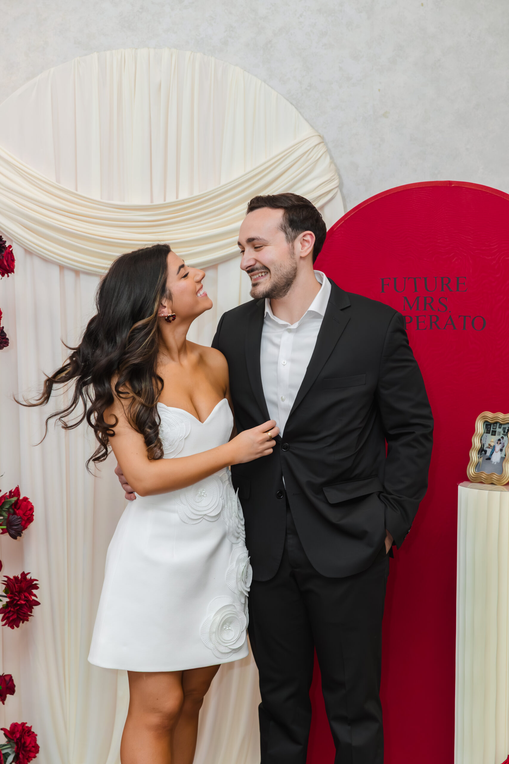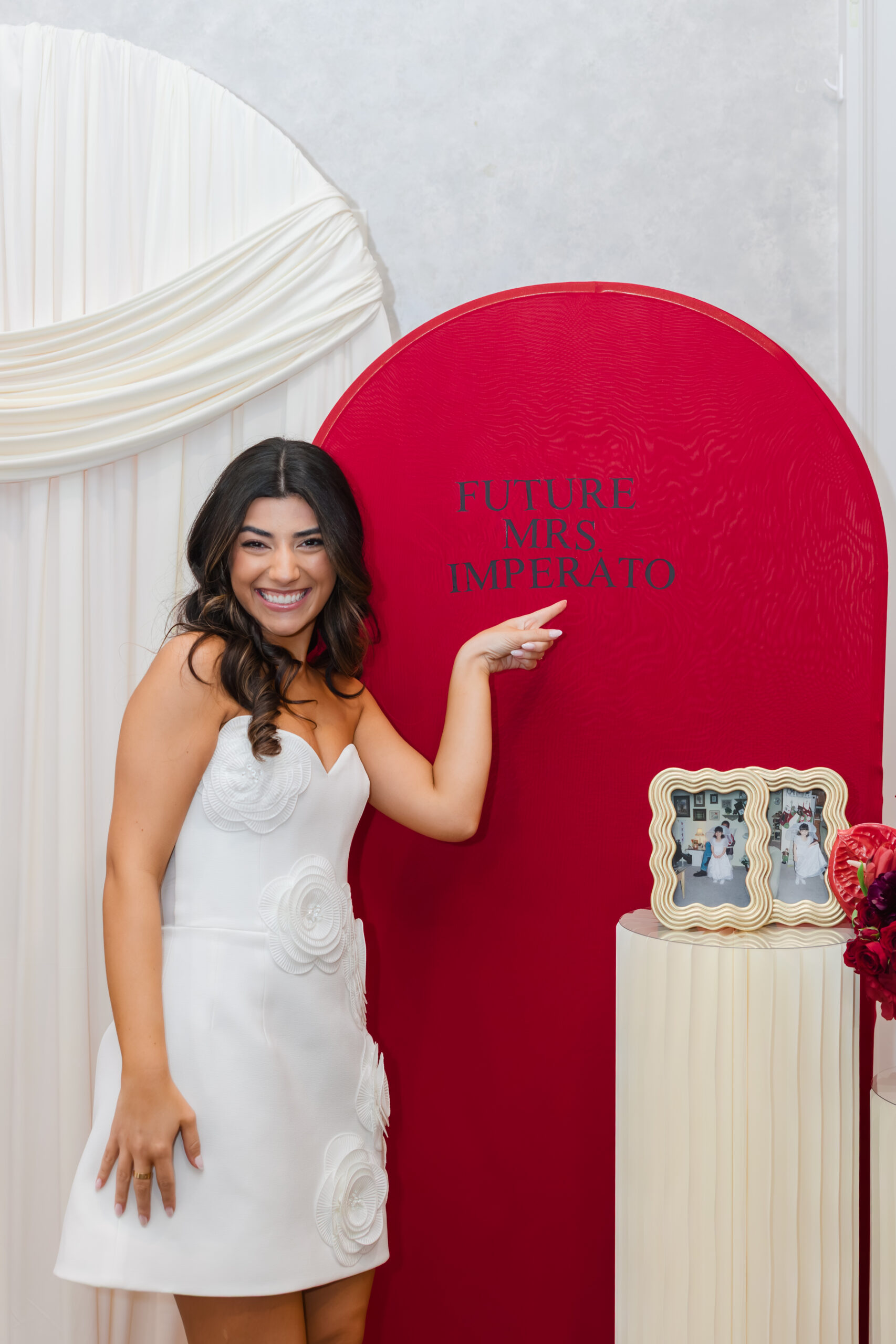As If the beautiful flower arrangements on the tables weren’t enough for Joanna to design, she also created the chicest custom-designed backdrop for photos. The entire installation was created and designed herself – layered ivory draping, sculptural shapes, bold red elements, and lush floral pillars that framed the space so beautifully. It felt editorial, romantic, and completely unique to her vision. Naturally, it became the focal point of the day, where guests gathered for photos, hugs, and so many meaningful moments.