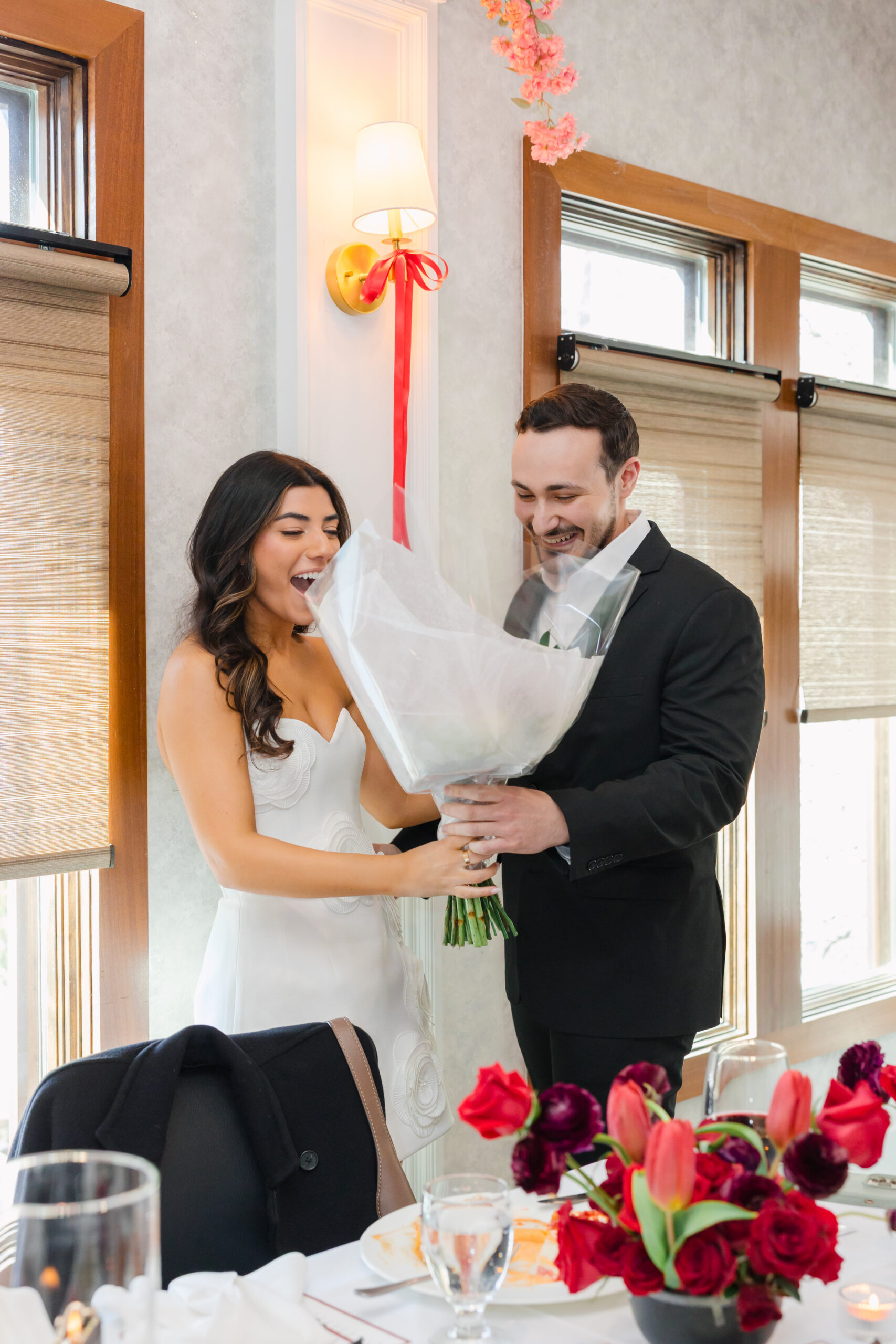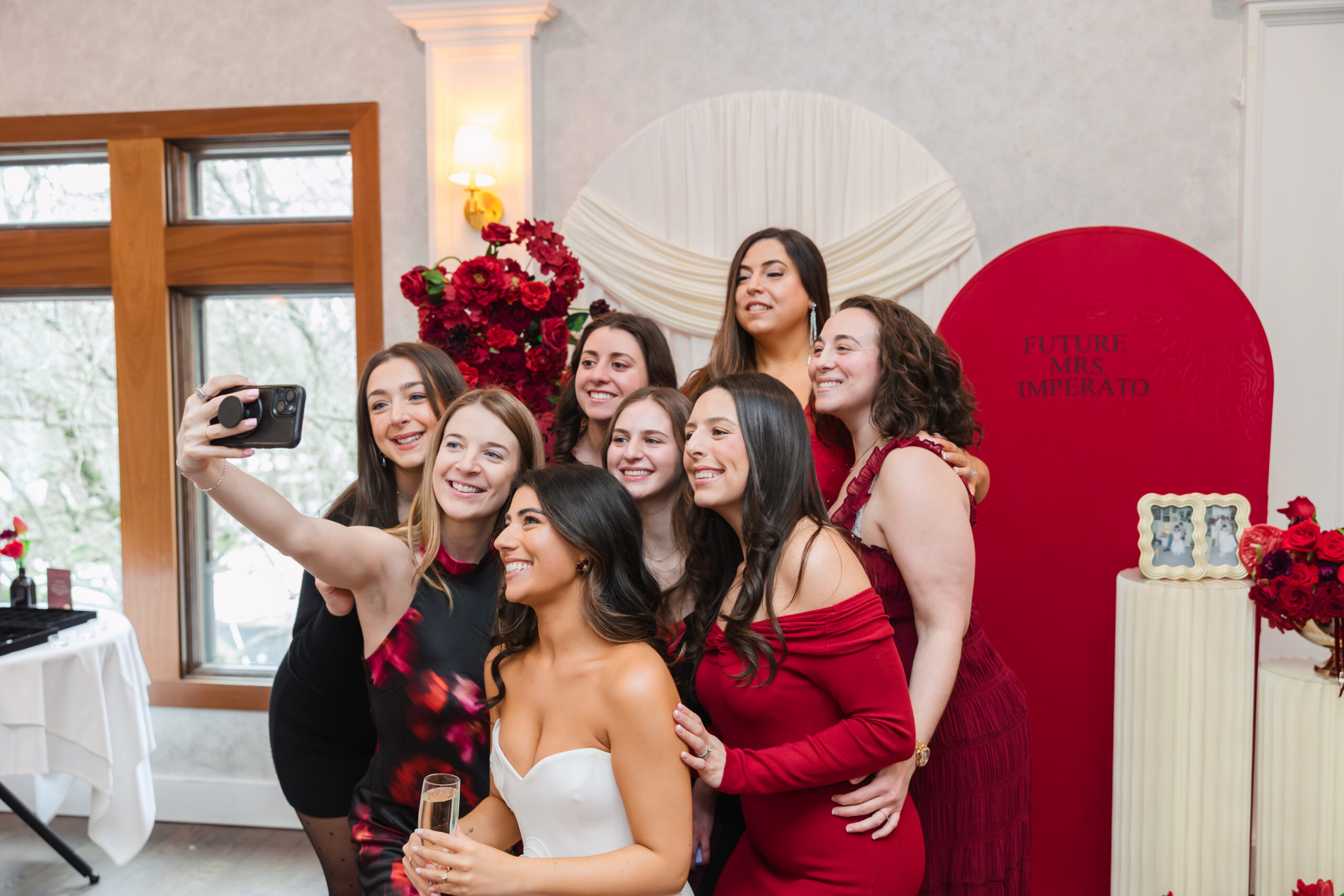 Joanna’s Romantic and Chic Bridal Shower hosted at Dimora in Norwood New Jersey. Dimora’s upstairs space was completely transformed into a romantic, elevated setting that felt both modern and inviting. Joanna’s design leaned into a rich, palette of deep reds, soft pinks, and warm neutrals, creating a chic and elevated space that felt cohesive from the moment guests arrived.