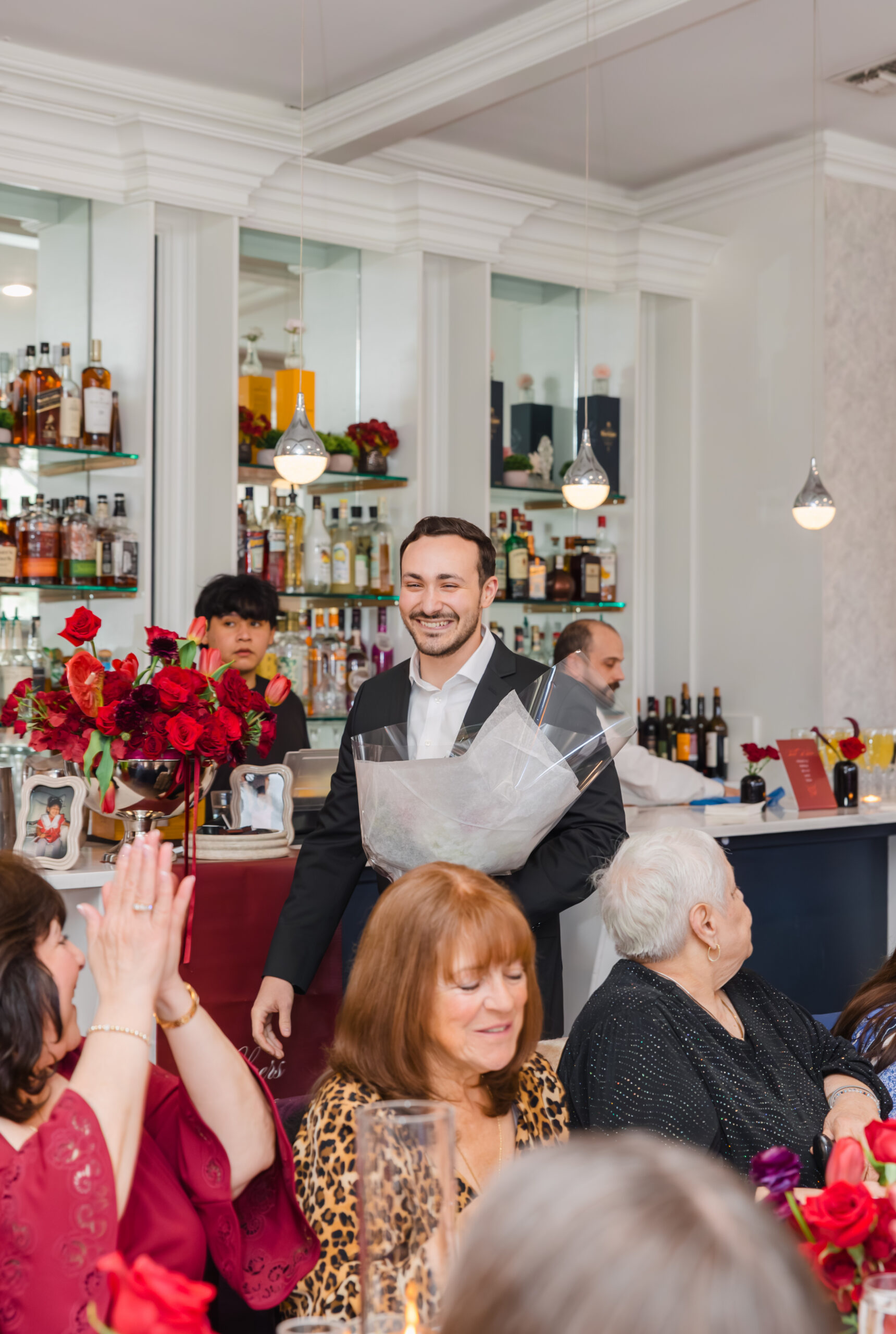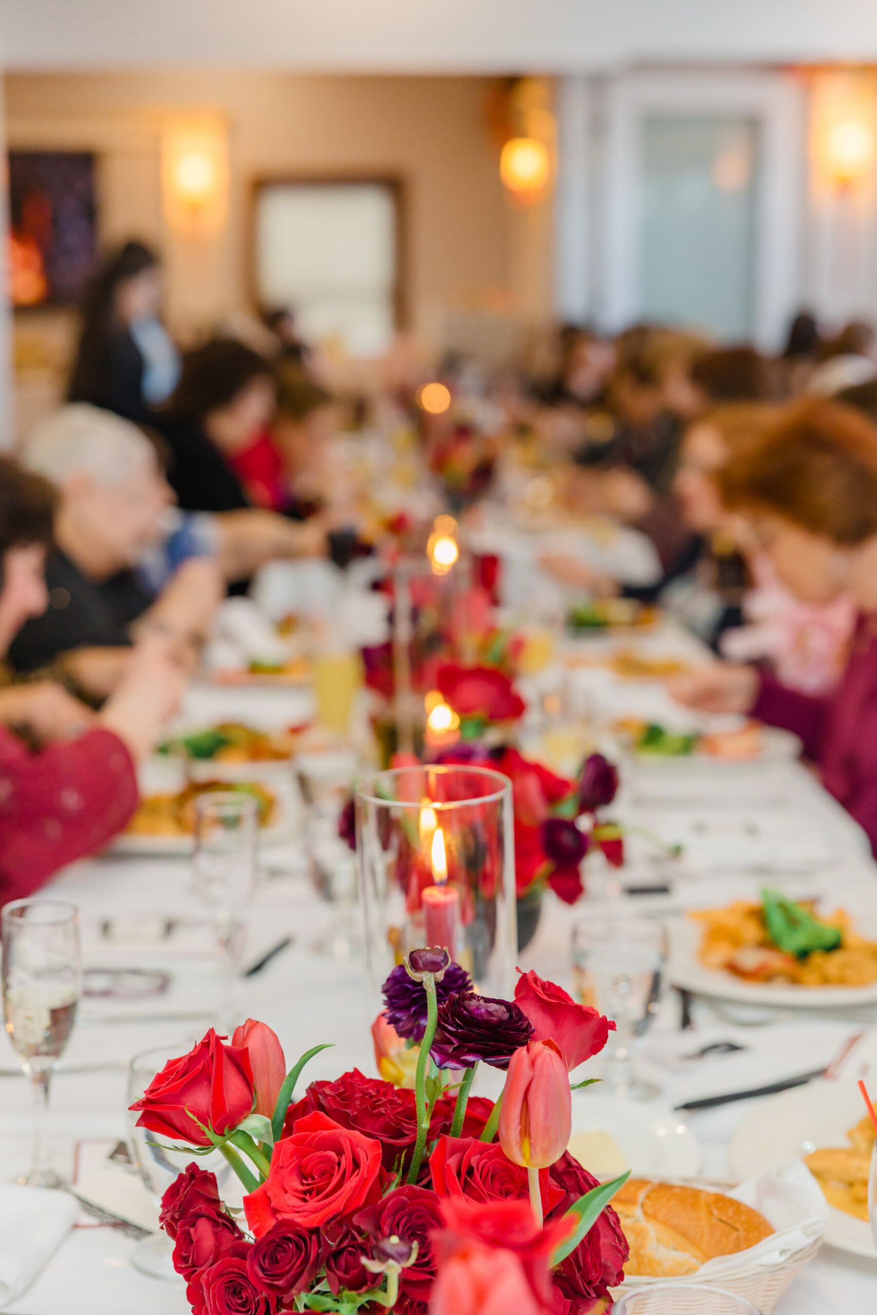As guests arrived, long tables were styled with crisp white linens and lined with black chairs, allowing the florals to truly stand out. Lush arrangements of roses and tulips ran down the center of each table, paired with glowing candlelight that added such a soft, intimate feel to the room. One of Joanna’s many talents is flower arrangements so I just knew the flowers were going to be beyond gorgeous!